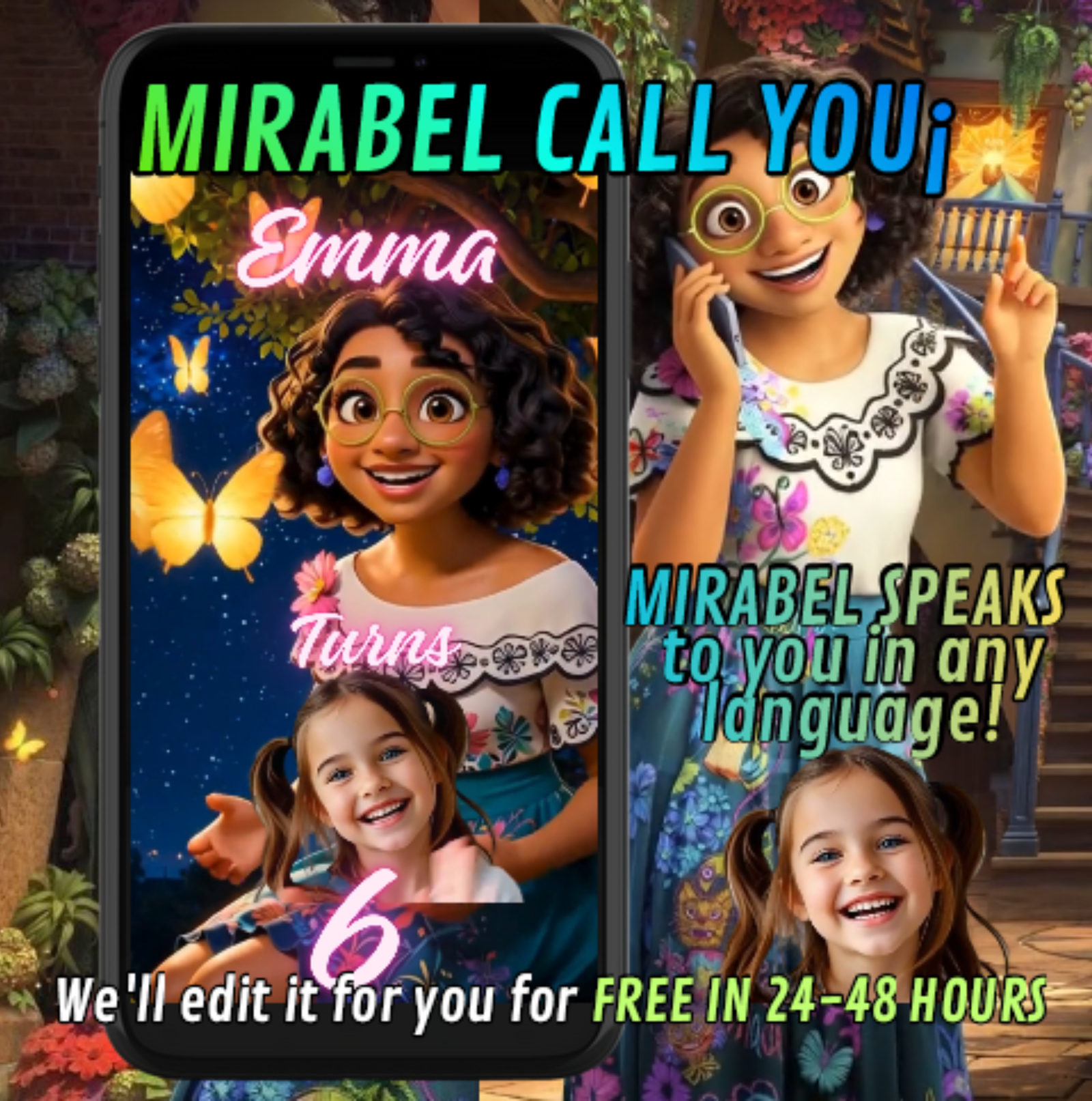 MIRABEL speaks directly to your child, says their name, congratulates them, and invites their friends and family to the party in any language! We can also add a photo or video of your children to the invitation if you wish.