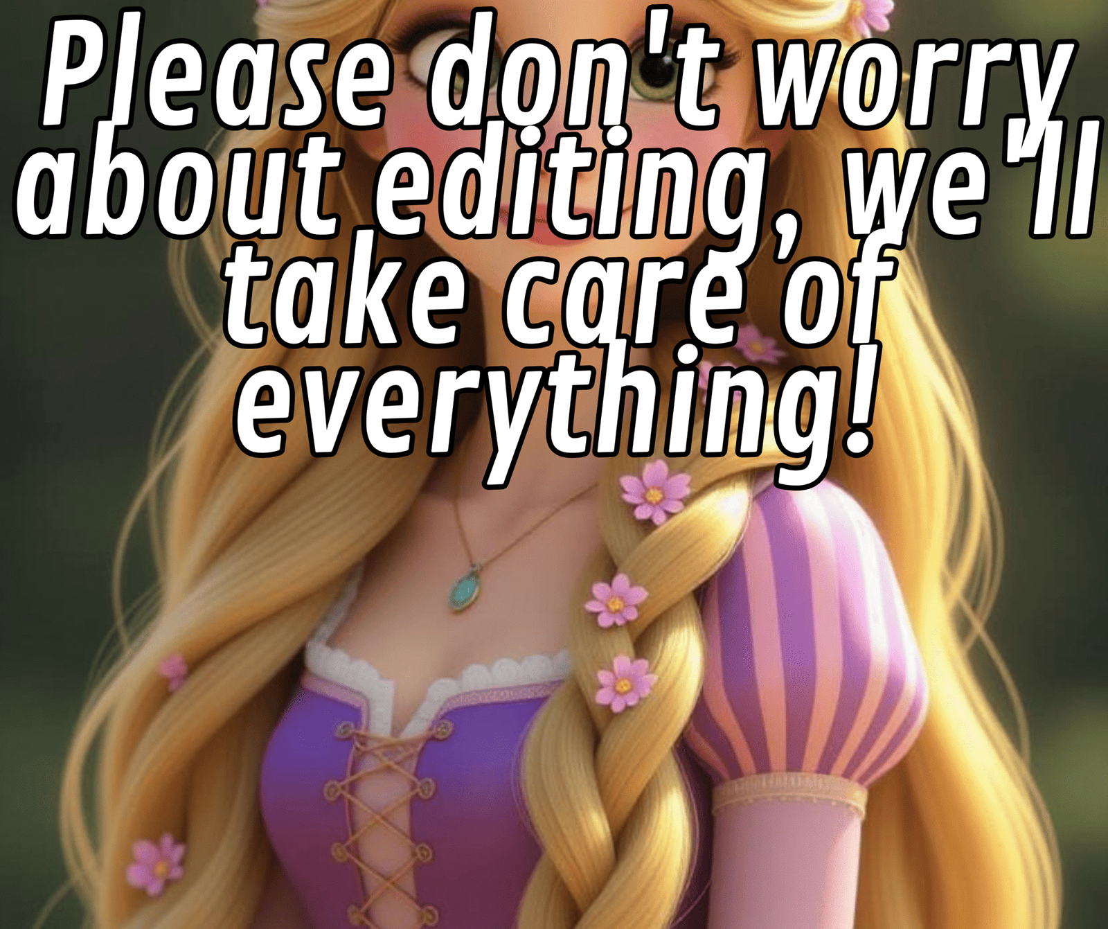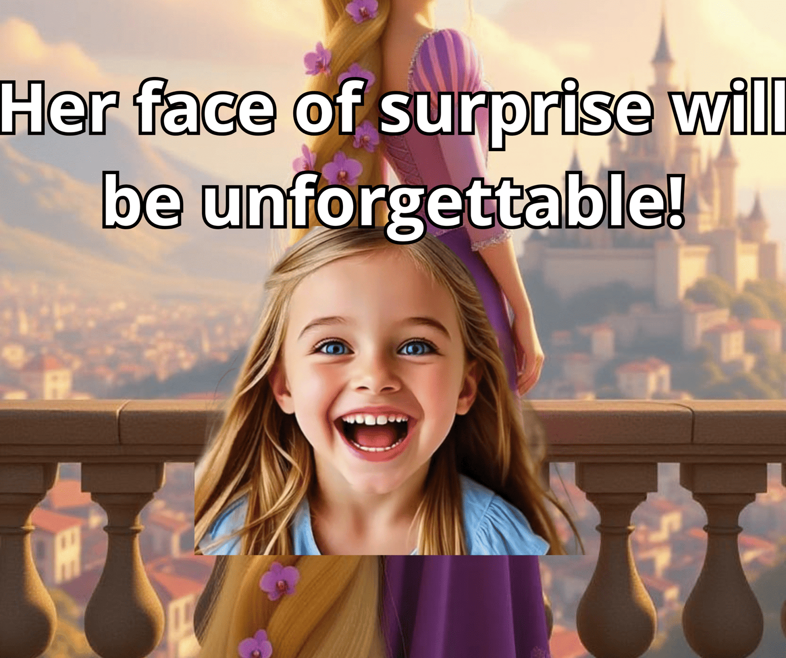 RAPUNZEL speaks directly to your child, says their name, congratulates them, and invites their friends and family to the party in any language! We can also add a photo or video of your children to the invitation if you wish.