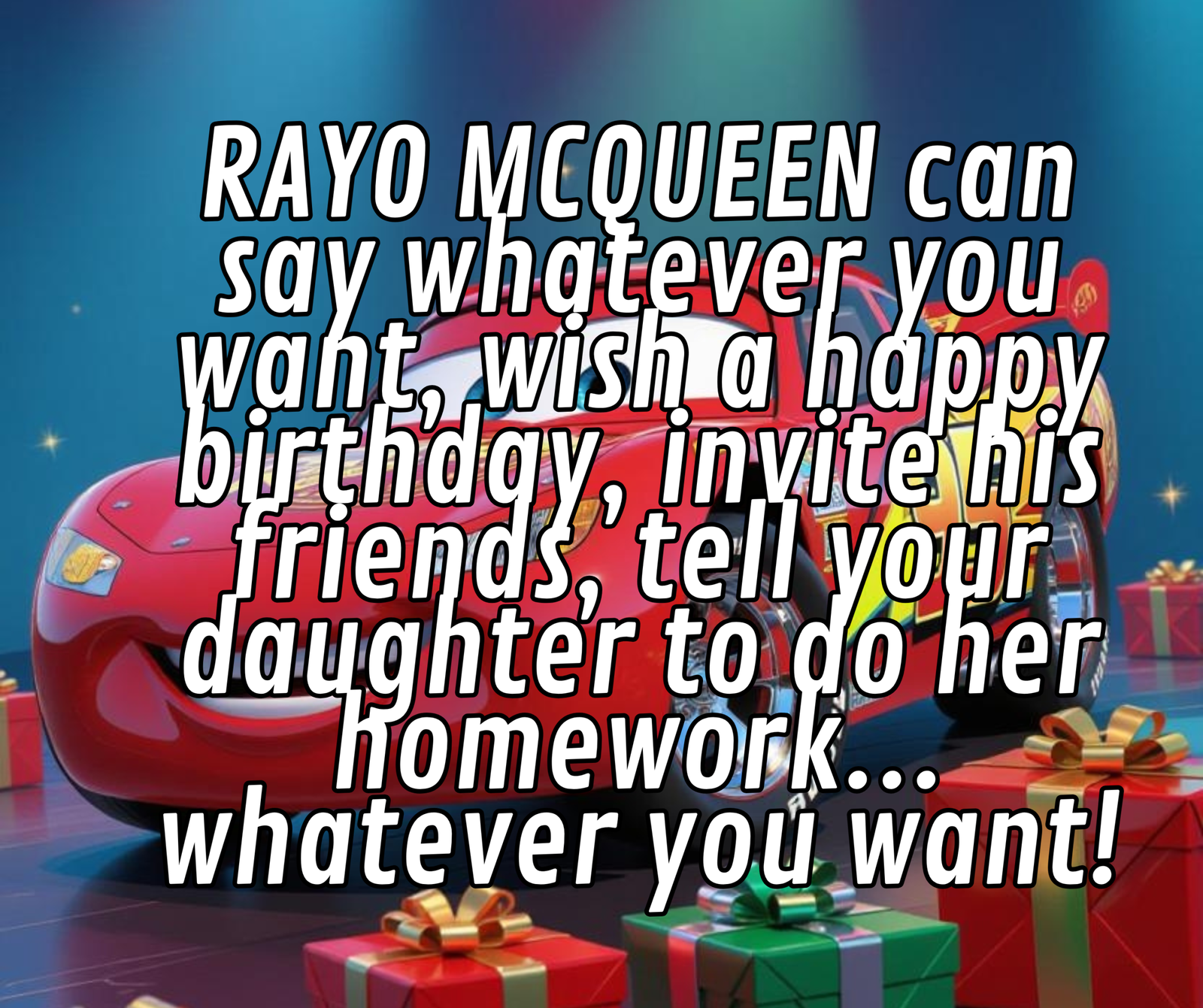 Rayo Mcqueen speaks directly to your child, says their name, congratulates them, and invites their friends and family to the party IN ANY LANGUAGE! We can also add a photo or video of your children to the invitation if you wish.