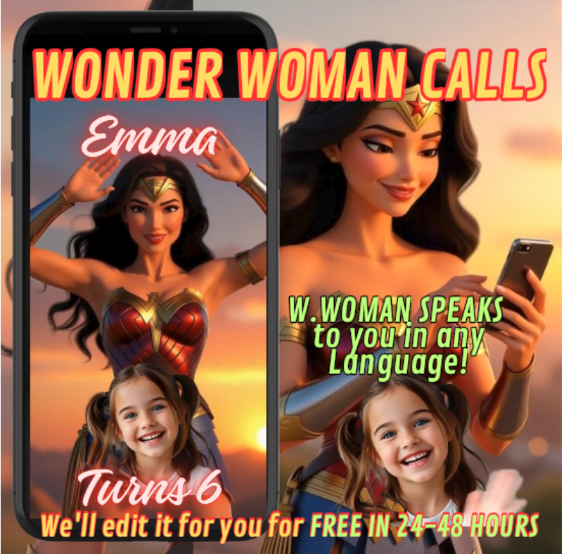 Wonder Woman speaks directly to your child, says their name, congratulates them, and invites their friends and family to the party in any language! We can also add a photo or video of your children to the invitation if you wish.